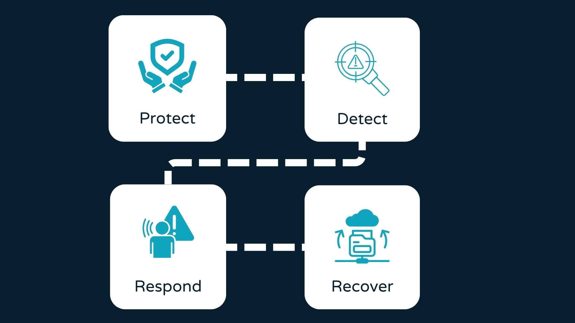Flowchart illustrating four steps: Protect with a shield icon, Detect with a warning sign and magnifying glass icon, Respond with a person and alert icon, and Recover with a cloud and folder icon.